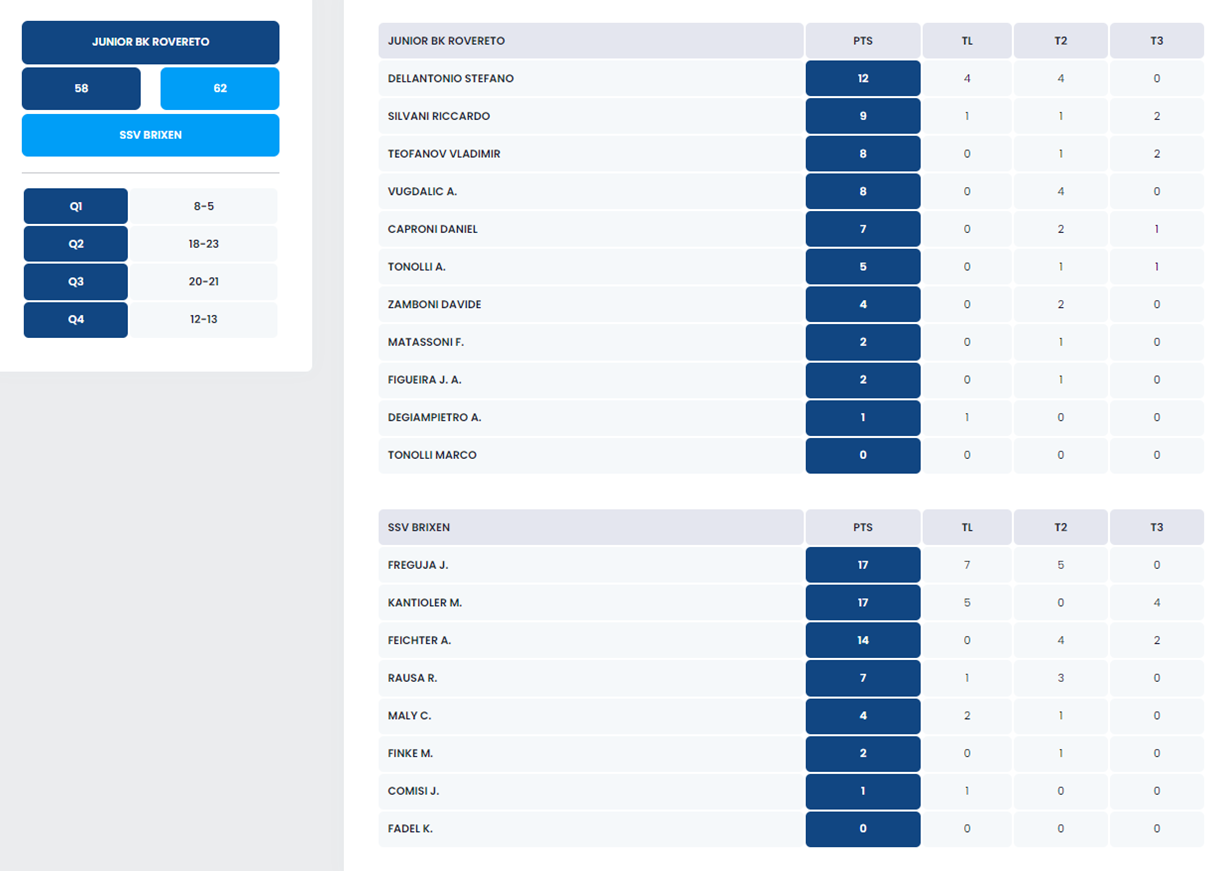 Junior BK Rovereto 58:62 SSV Brixen Basketball (8:5, 18:23, 20:21, 12:13)